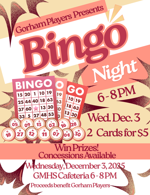 Save the Date! Join the Gorham Players theater group for an evening of BINGO, Wednesday, Dec. 3 from 6-8pm.