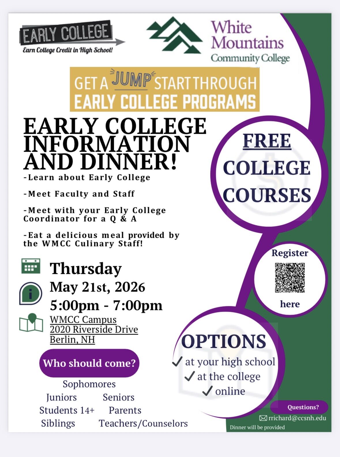 Hi All, If you are interested in learning more about Early College classes, you are invited to attend this this informational dinner at WMCC on May 21st. Parents and students are all welcome! Pleas...